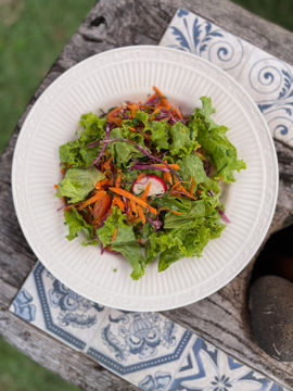 lettuce, cucumbers, tomatoes, and carrots, tossed in a light vinaigrette.