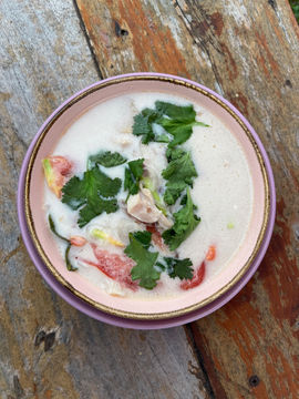 coconut milk, potato, carrots with an aromatic spice paste blend of red chili peppers, garlic, lemongrass, galangal, shallots, spices, and asian herbs